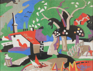 The bold colors and flat shapes in 4 A.M. make the work unique in Calvin’s oeuvre, as does the inclusion of the title in letters and numerals at the bottom of the image. The reduced, primary palette and graphic style are reminiscent of illustrations by Wanda Gág, an artist best known for her children’s book Millions of Cats, first published in 1928 and still in print. While Fletcher’s artistic inspiration for this new style is unknown, the work demonstrates his artistic versatility and whimsy.